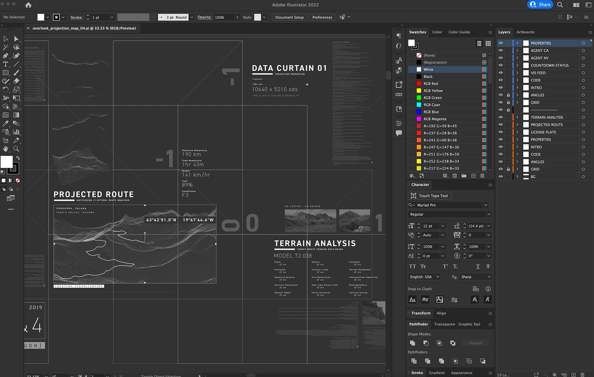 Some UI assets, like this terrain rendering, were created in Houdini and added to the Illustrator file.
